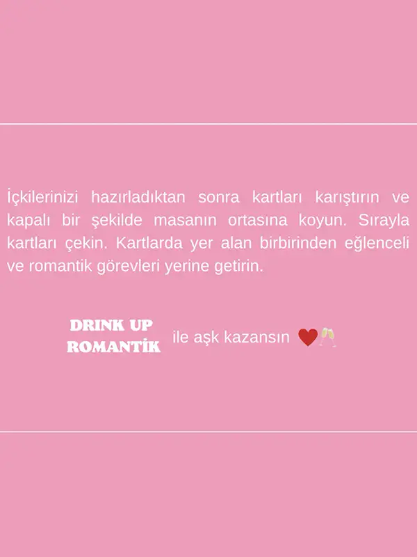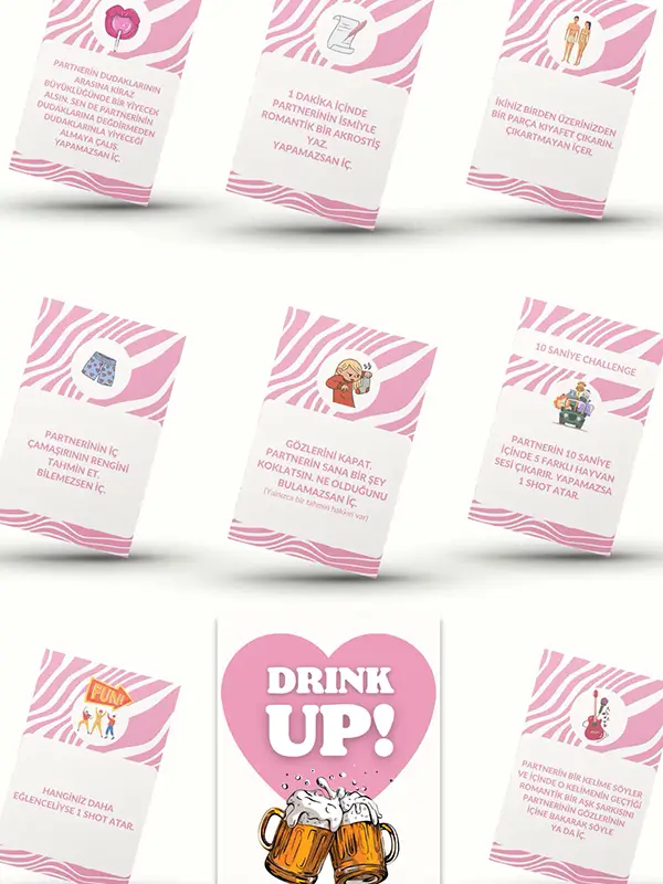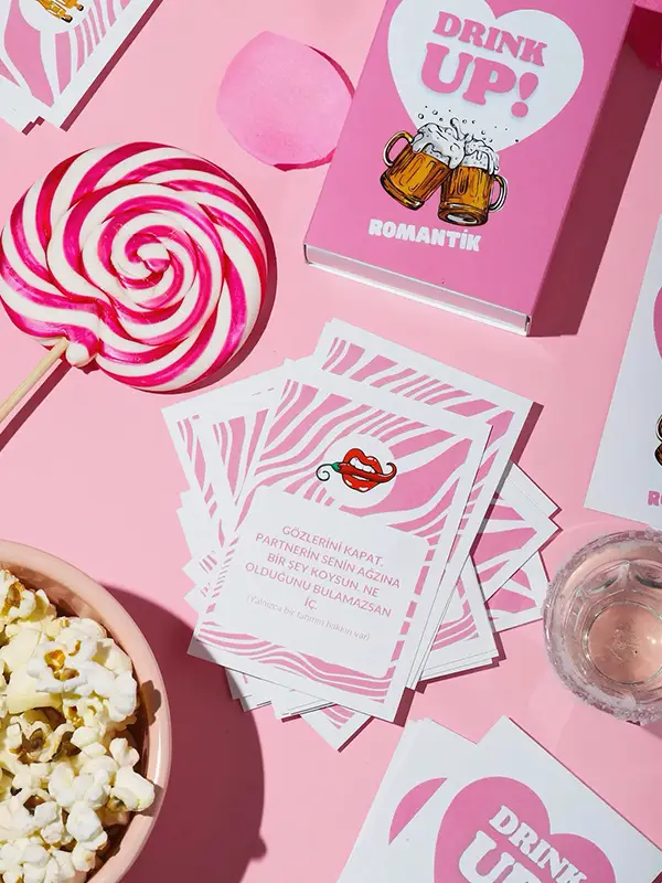 Drink Up Romantik, çiftler için özel olarak tasarlanmış, romantik ve eğlenceli görevlerin yer aldığı içki oyunudur. Gözlerin kapalıyken partnerin ağzına bir şey koyar ve ne olduğunu tahmin etmeye çalışırsın; ya da dudaklarının arasına bir yiyecek alır, partnerin dudaklarına değmeden onu almaya çalışır; bazen de partnerinin ismiyle bir dakika içinde romantik bir akrostiş yazman gerekir — yapamayan her seferinde içmek zorunda kalır. Sevgililer Günü, yıl dönümleri, çift kaçamakları için idealdir.