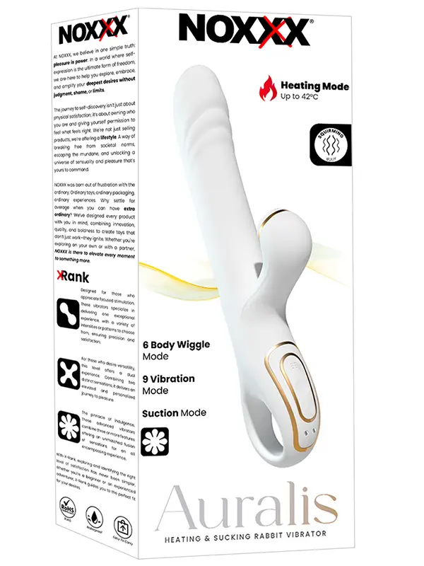 NOXXX Auralis tavşan vibratör, 9 titreşim modu, 6 kıvrılma hareket modu, güçlü emme modu ve ısıtma özelliği ile en üst düzeyde haz deneyimi sunar. 24 cm uzunluğa ve 3,5 cm genişliğe sahip bu özel tasarım, G-noktasını hedeflerken aynı anda klitoris bölgesini güçlü şekilde uyarır. Su geçirmez yapısı sayesinde banyoda veya duşta güvenle kullanılabilir. Şarj edilebilir bataryası uzun süreli kesintisiz kullanım imkanı verir. Vücut dostu silikon malzeme ile üretilmiş olan NOXXX Auren, lüks görünümüyle estetik ve işlevselliği bir araya getirir.